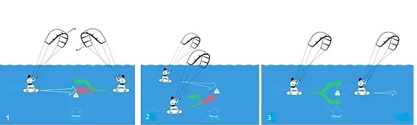 4. הקייט שמעל הרוח ירים את הקייט וזה שבמורד הרוח יוריד את הקייט, כך שלשניהם יהיה המרחב הדרוש להמשיך
